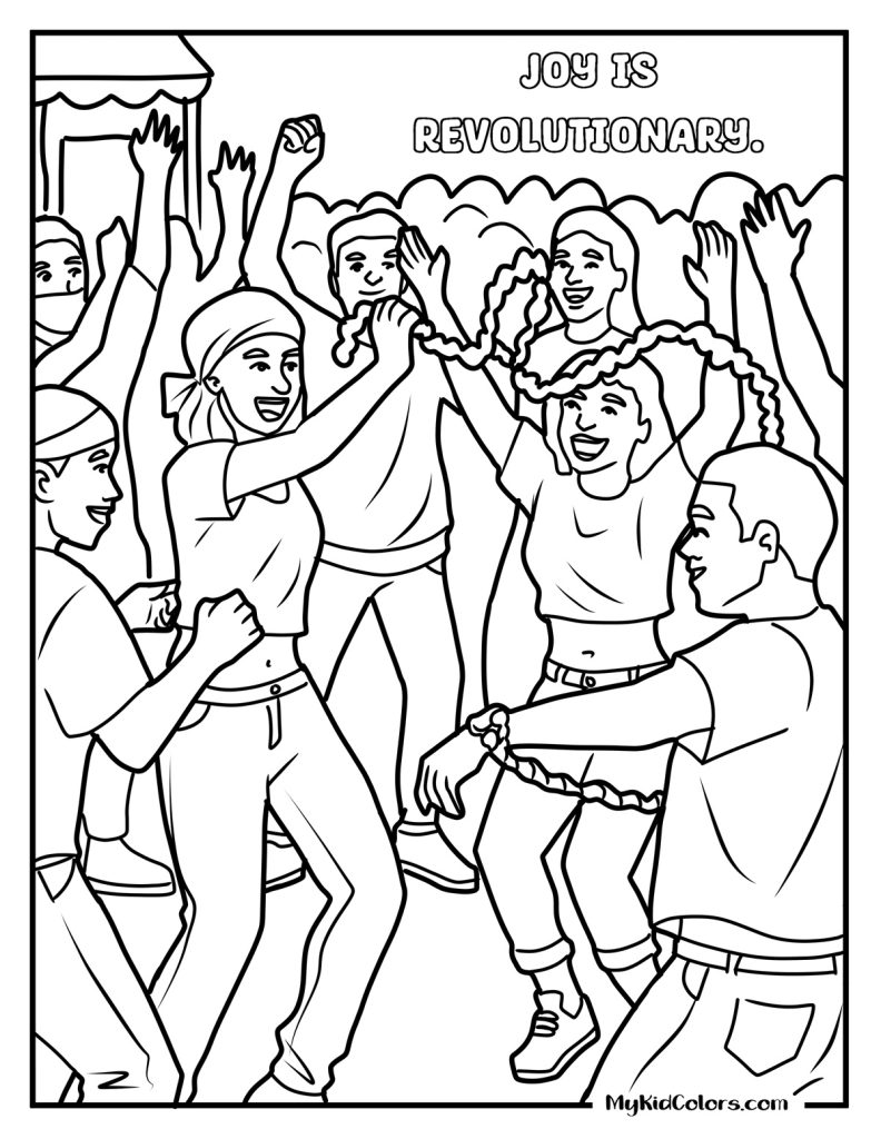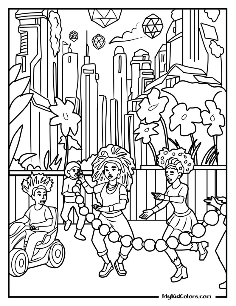 • The Party Energy:ย Two siblings dressing their dog for the parade (Page 8), an elegantย masquerade masks coloring pagesย scene (Page 9), and an epic 90s-inspired urban block party (Page 10).