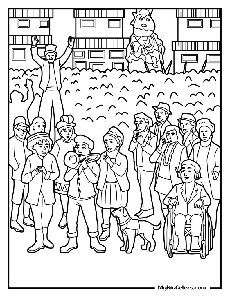 • Wimmelbilder:ย An ultra-detailed New Orleans parade scene packed with diverse characters, wheelchairs, and hearing aids, perfect forย Mardi Gras worksheets for kidsย (Page 12).