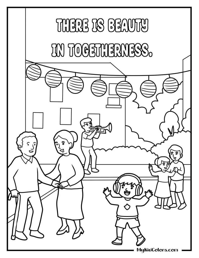 Perfect for elementary kids. These pages visualize family traditions, creativity, and neighborhood block parties.