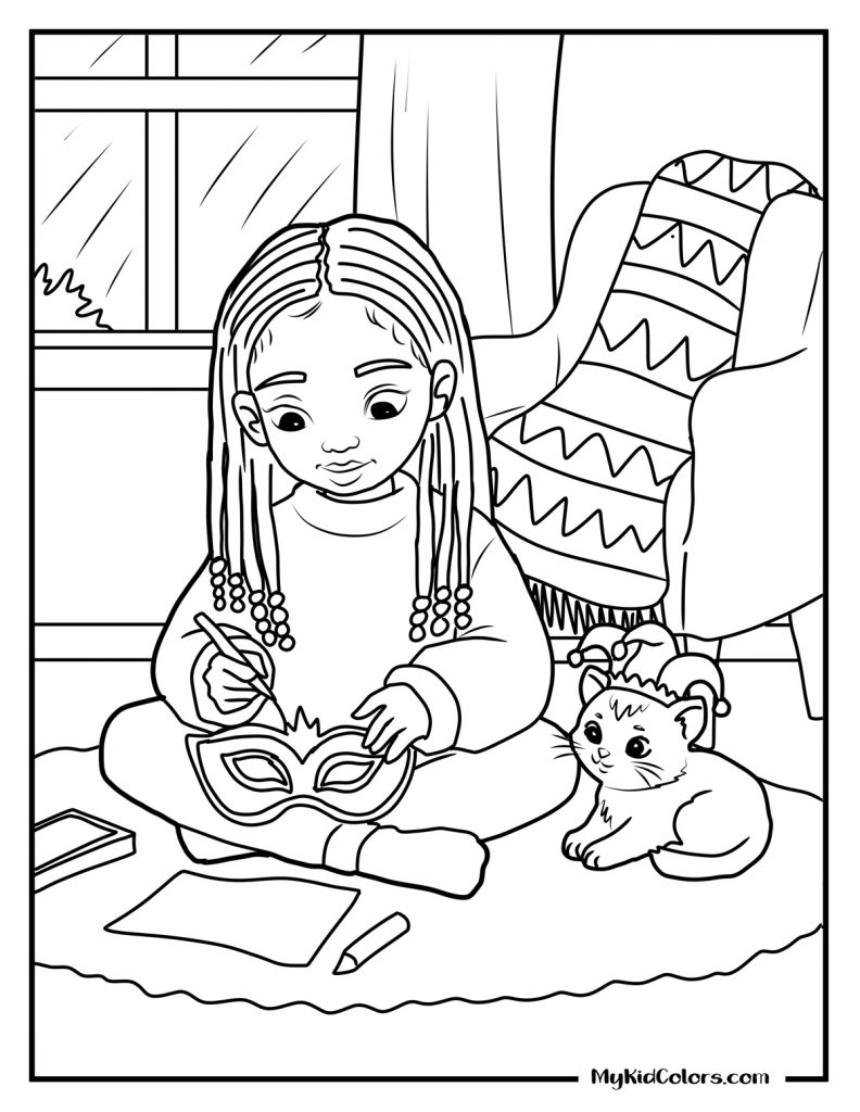 • Indoor Celebrations:ย Kids dancing with mini parade flags (Page 2) and a girl creating aย mardi gras mask drawingย with her kitten (Page 3).