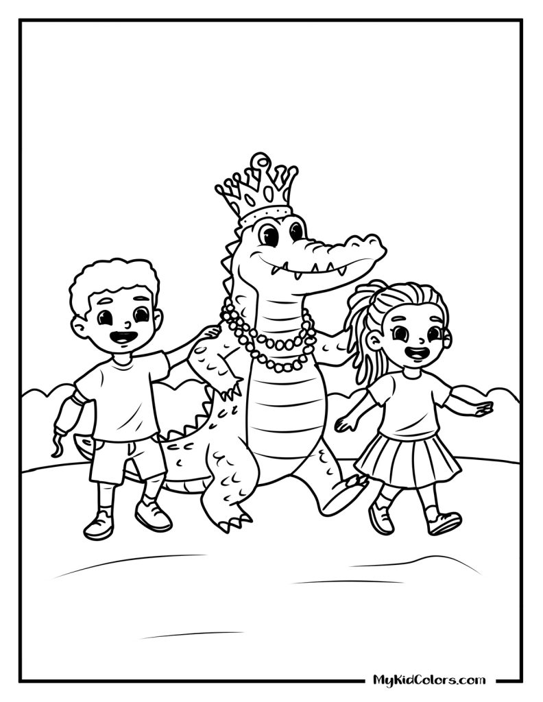 • Fantasy & Community:ย A friendly cartoon alligator wearing beads (Page 4) and a cozy New Orleans street scene with families watching the parade (Page 5).