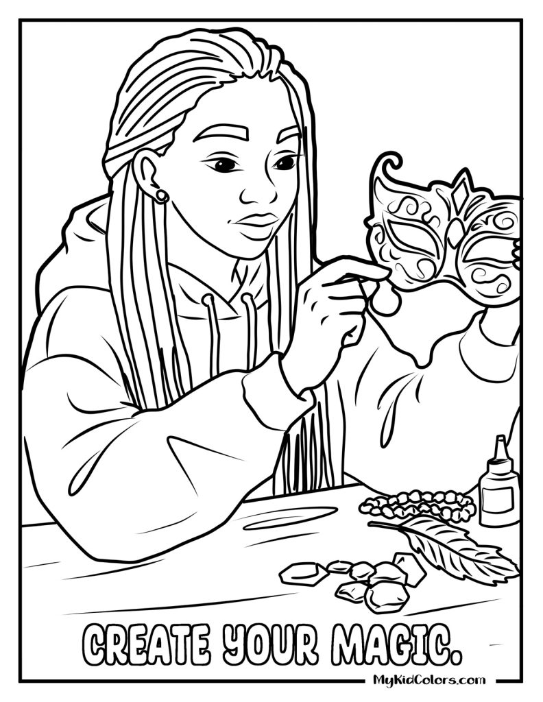 • Creative Magic:ย A Black teen girl designing an elaborate mask with an ADHD-friendly fidget toy nearby (Page 6).