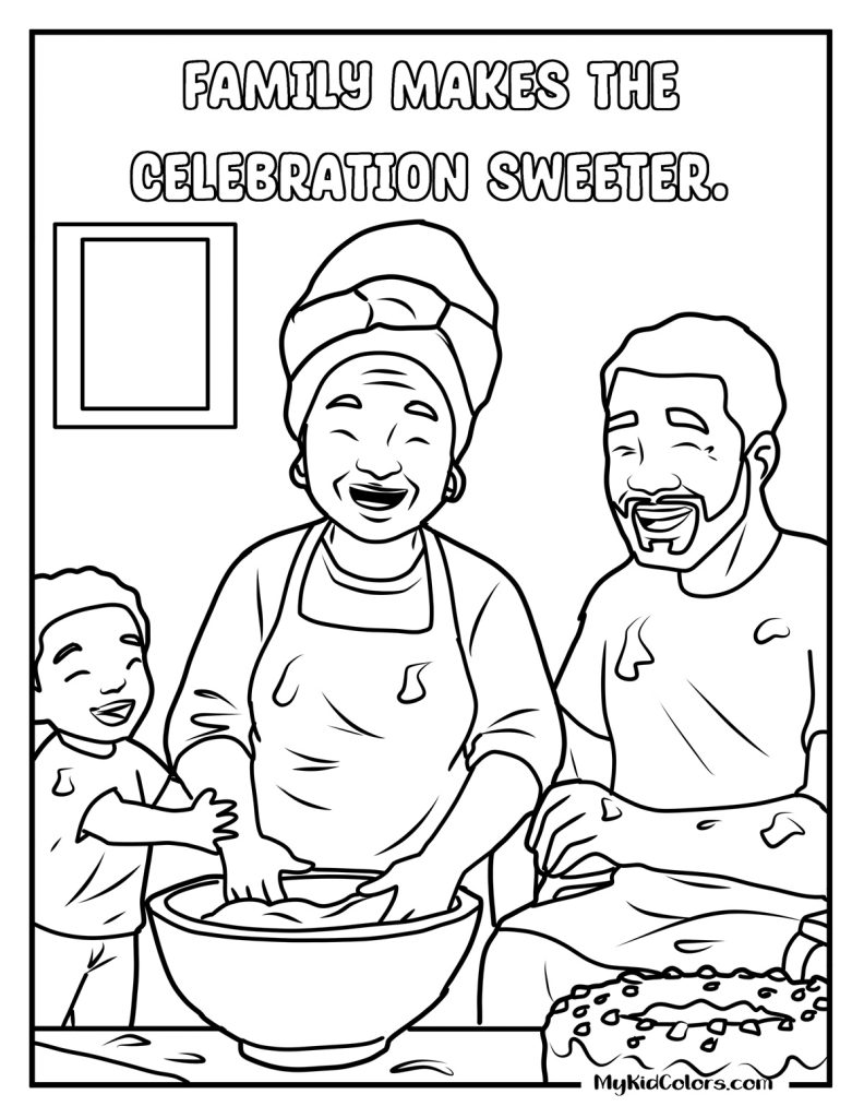 • Family Traditions:ย A multigenerational Black family baking aย king cake coloring pageย scene together (Page 7).