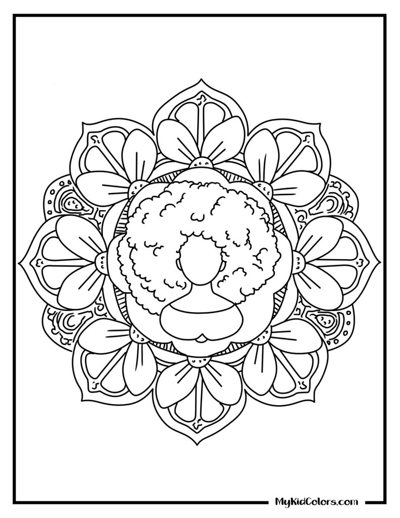- Finding the Center: A beautiful, easy mandala with a subtle afro-textured silhouette (Page 1) that serves as the perfect introduction to mandalas for mindfulness.