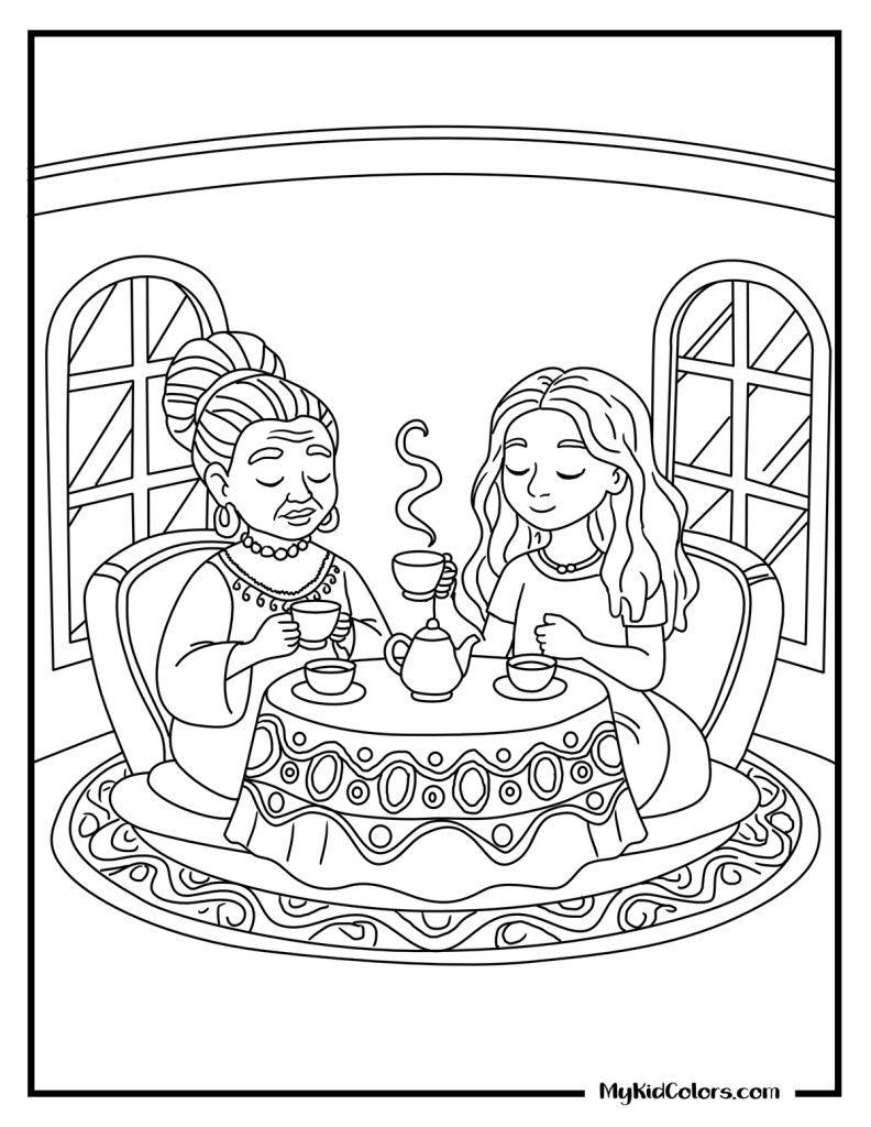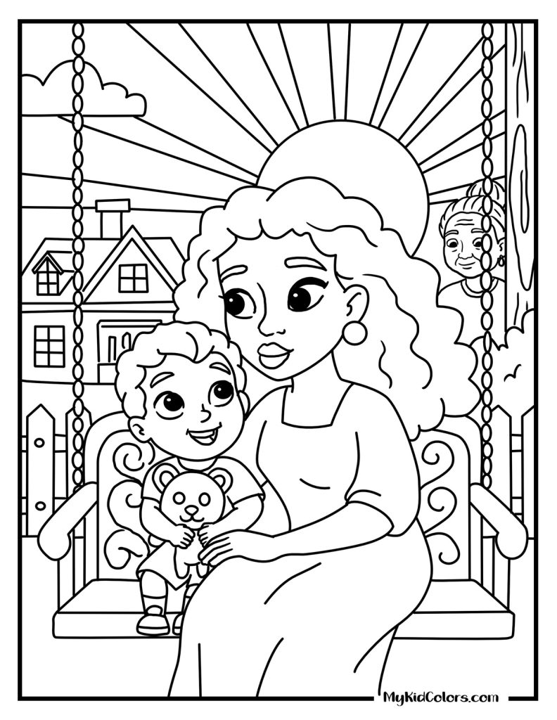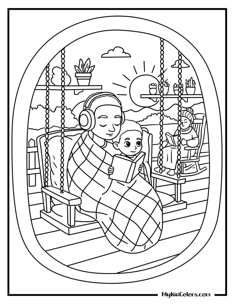- Connection: A sweet intergenerational quiet moment on a porch swing at sunset (Page 10) to add to your mental health coloring pages for kids.