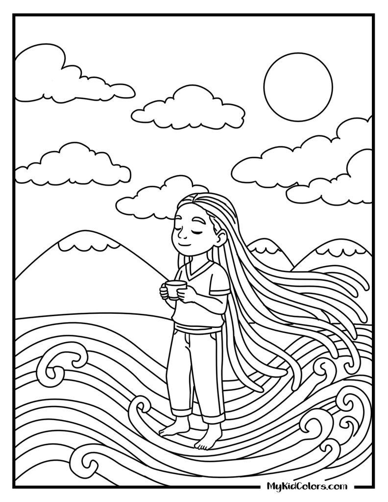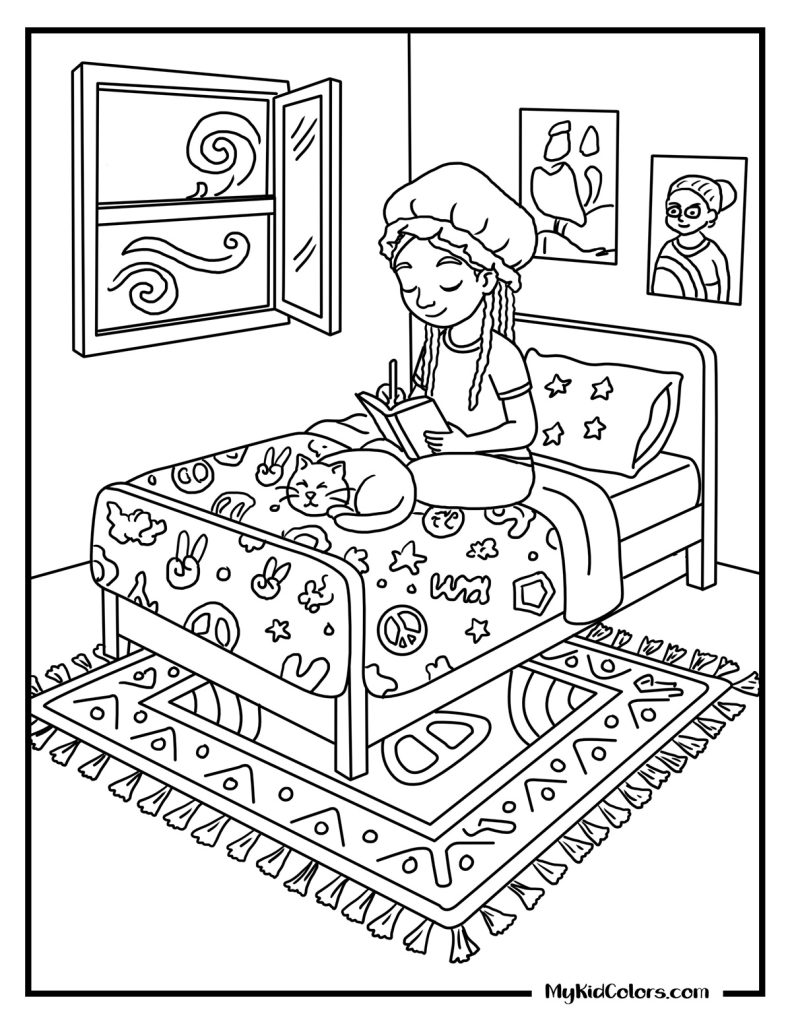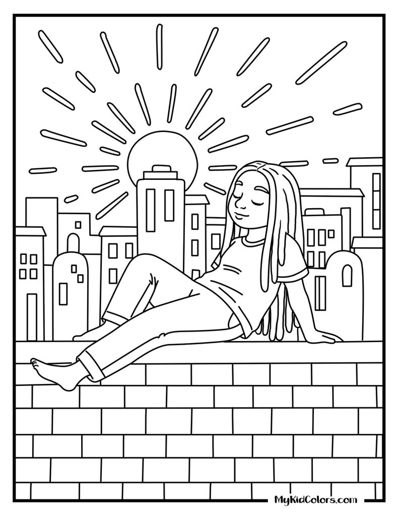 - Finding Flow: An Afrofuturist ocean flow scene (Page 12) and a teen resetting on a city rooftop at sunset (Page 14). These make incredible color therapy coloring pages for teens and adults alike.