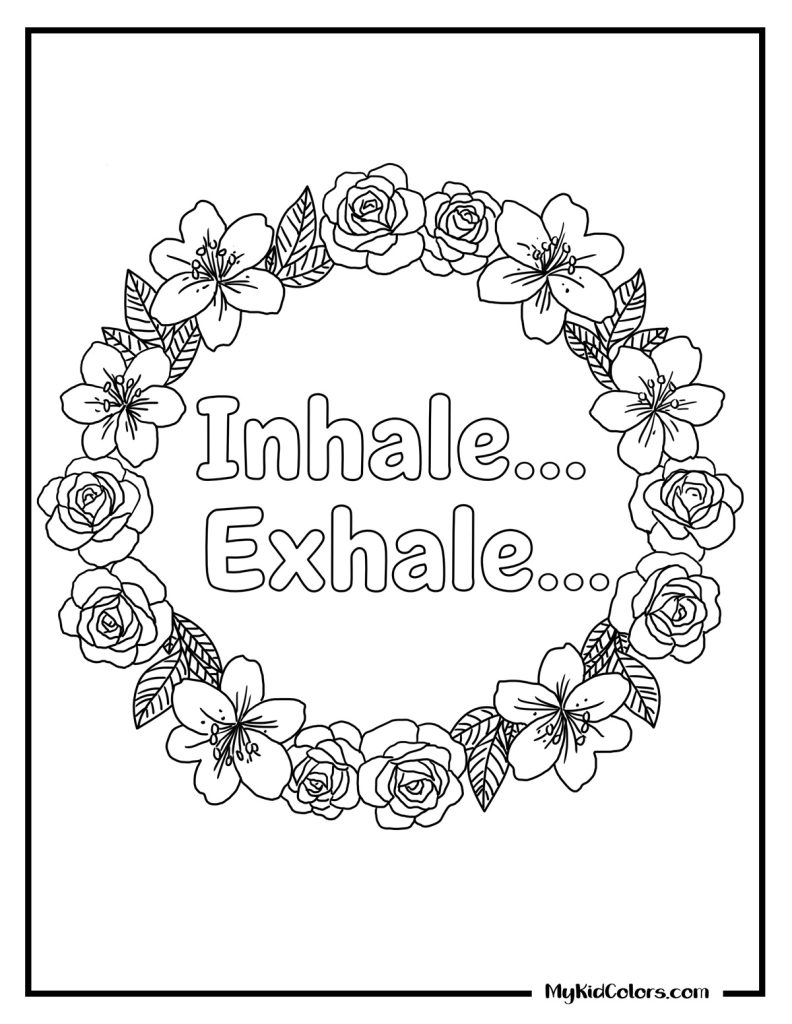 - Deep Breaths: An “Inhale… Exhale…” floral frame (Page 2) and a Calm Heart Affirmation (Page 3) to use as gentle positive coloring pages.