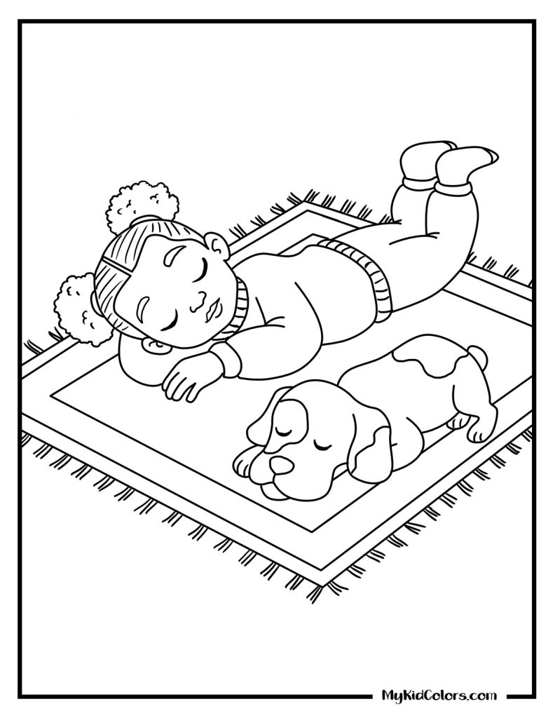 - Quiet Rest: A cozy preschooler taking a deep breathing moment (Page 4) and a sweet child resting peacefully with their dog (Page 5). These are wonderful calming coloring pages for early learners.
