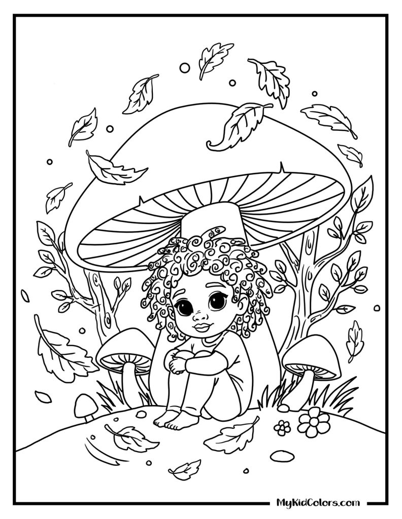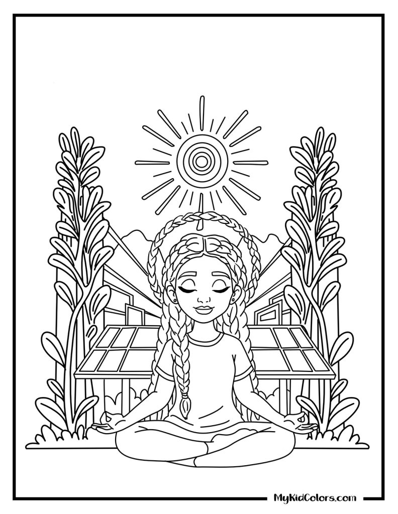 - Nature & Imagination: A tween meditating in a Solarpunk garden (Page 6) and a Goblincore forest pause under oversized mushrooms (Page 7)—excellent relaxing coloring pages.