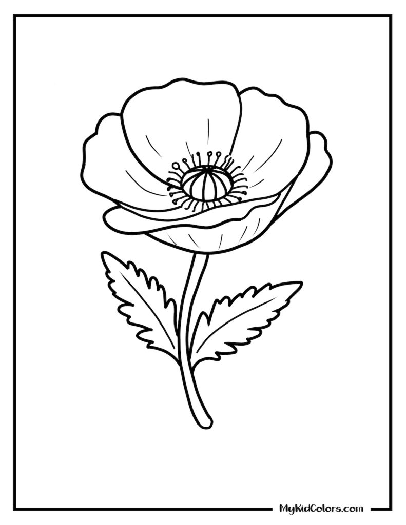 - Single detailed poppy flower with shading lines for older kids and adults.