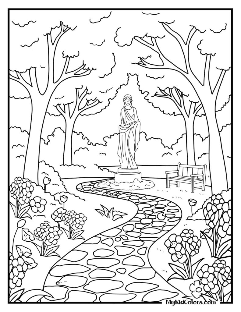 - Garden with a stone bench and statue surrounded by peaceful greenery.