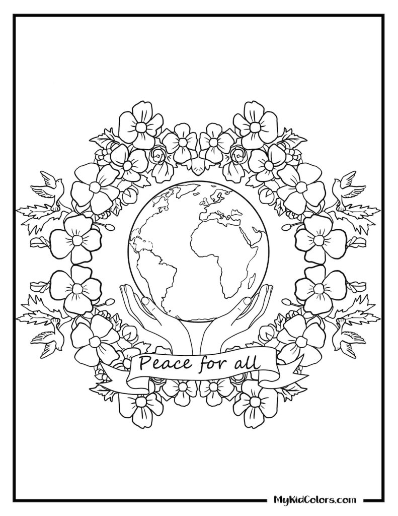 - Hands holding a globe with doves, poppies, and “Peace for all.”