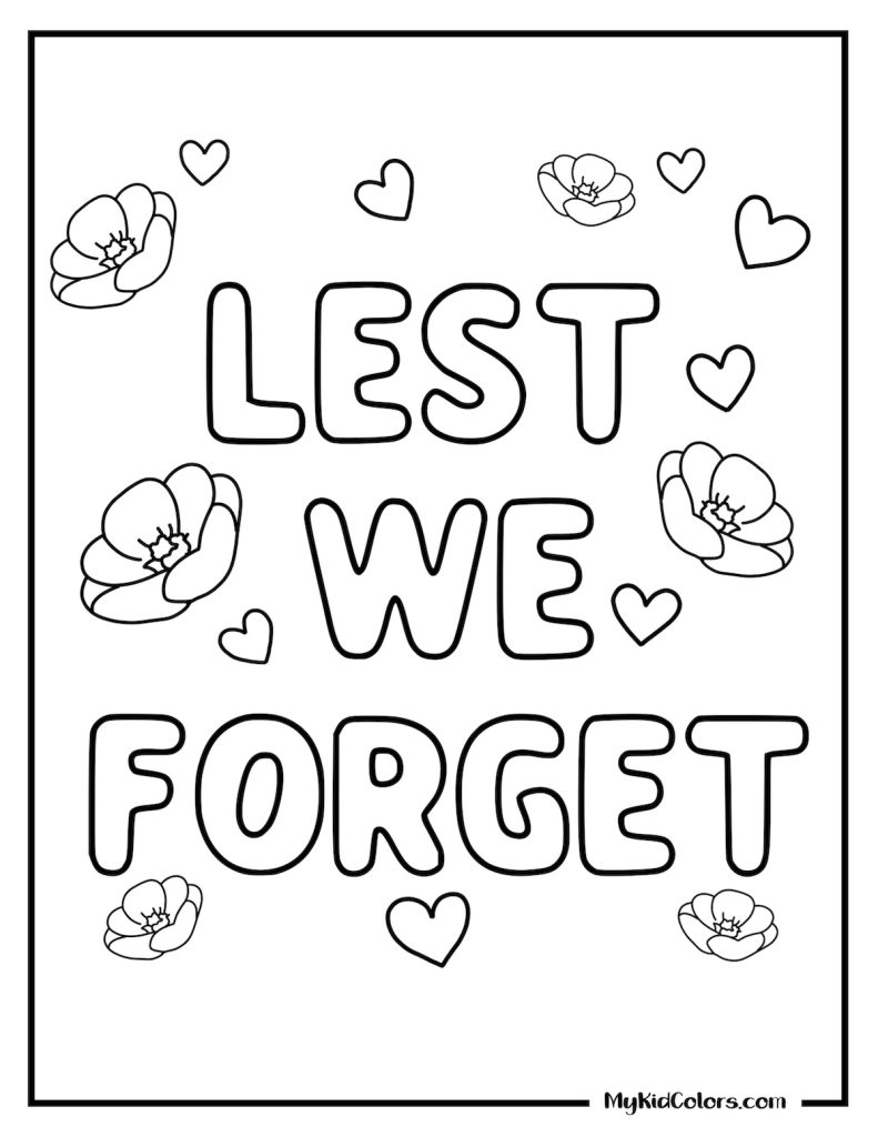 - “LEST WE FORGET” in bold lettering with a heart, simple for little artists.