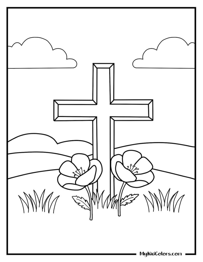 - Cross in a grassy field with clouds and poppies growing nearby.