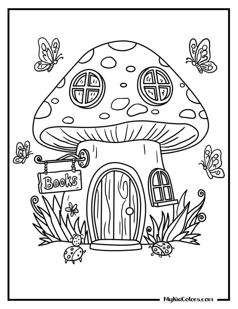 - Page 1: The mushroom library — A cozy, magical space that introduces books as a safe place for everyone, helping children feel welcome, calm, and curious.