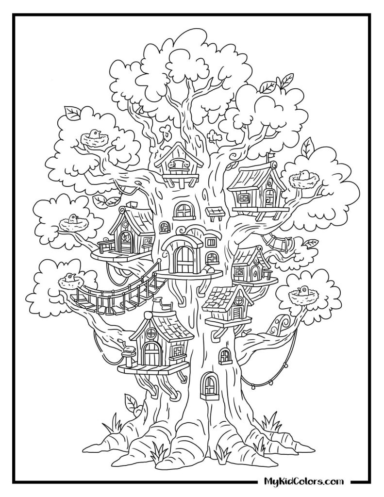 - Page 11: Treehouse village — A detailed scene showing a community living in harmony with nature, encouraging teamwork, cooperation, and shared responsibility.