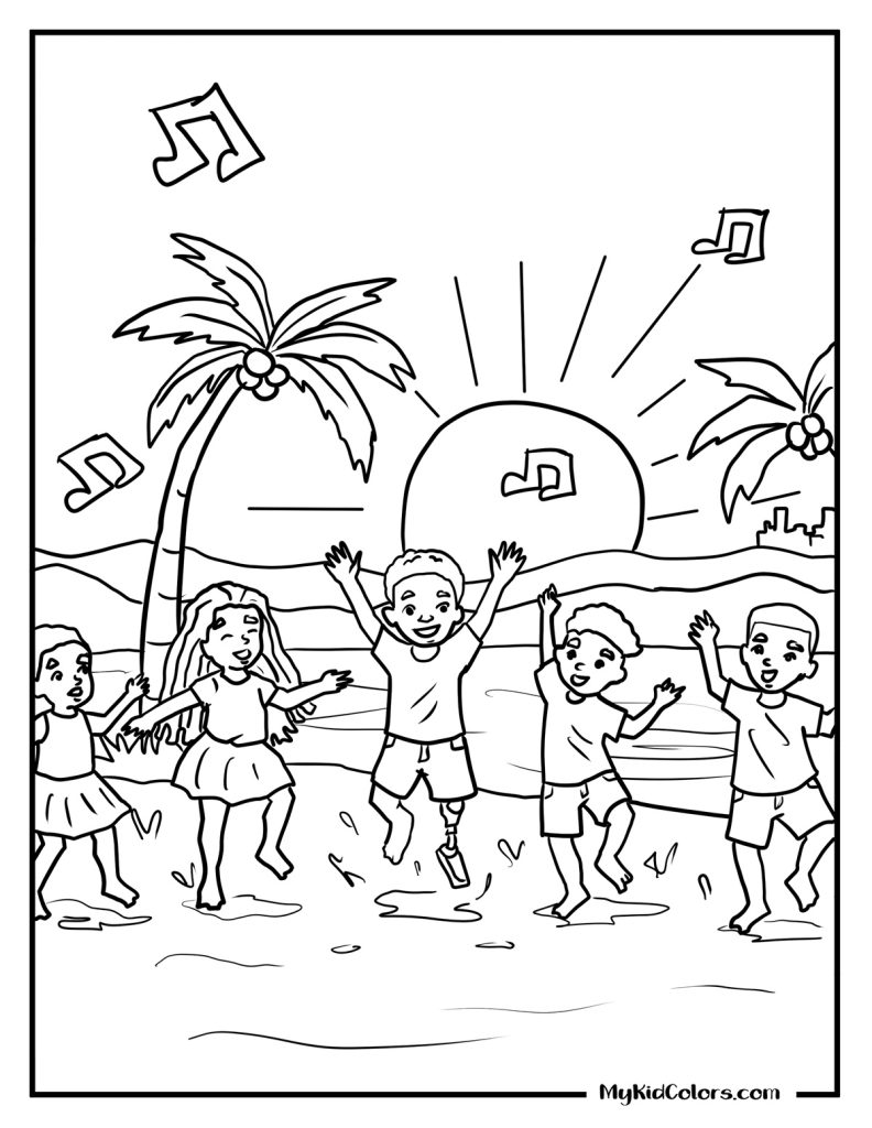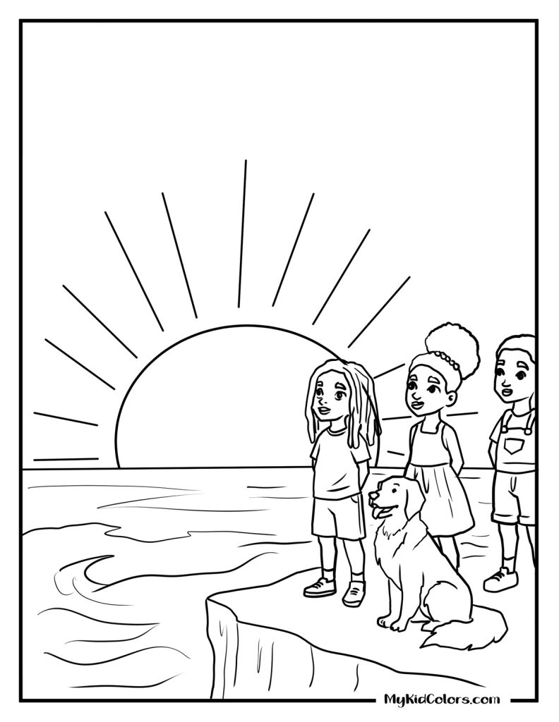- The Hero Page: Our breathtaking “Golden Hour Black Joy” illustration featuring three children and their dog standing on a cliff overlooking an ocean sunset (Page 15). This makes a gorgeous beach coloring pages free printable!