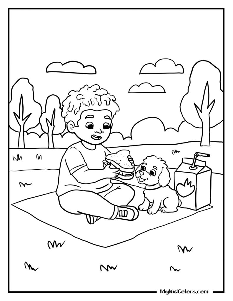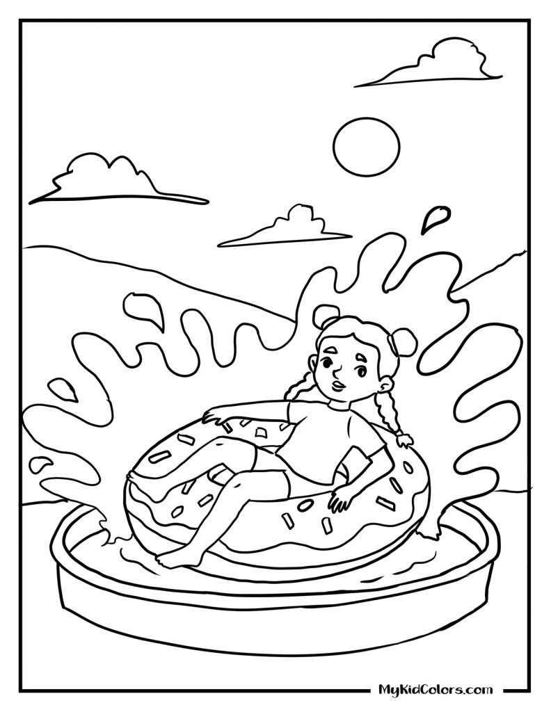 - Relaxing: A girl chilling on an oversized donut pool float (Page 3) and a sweet pet picnic (Page 5) to use as simple spring coloring sheets free printables.