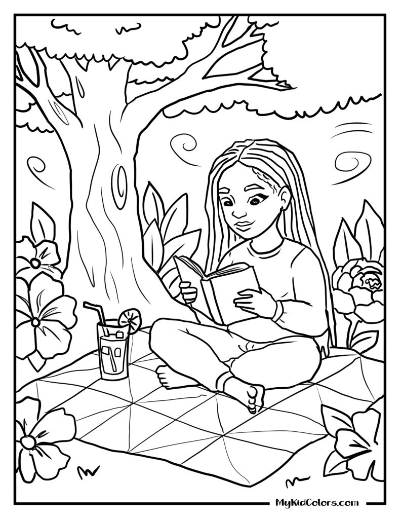 - Quiet Time: A cozy staycation reader relaxing under a tree with a cold drink (Page 8), making a beautiful free printable happy spring coloring pages.
