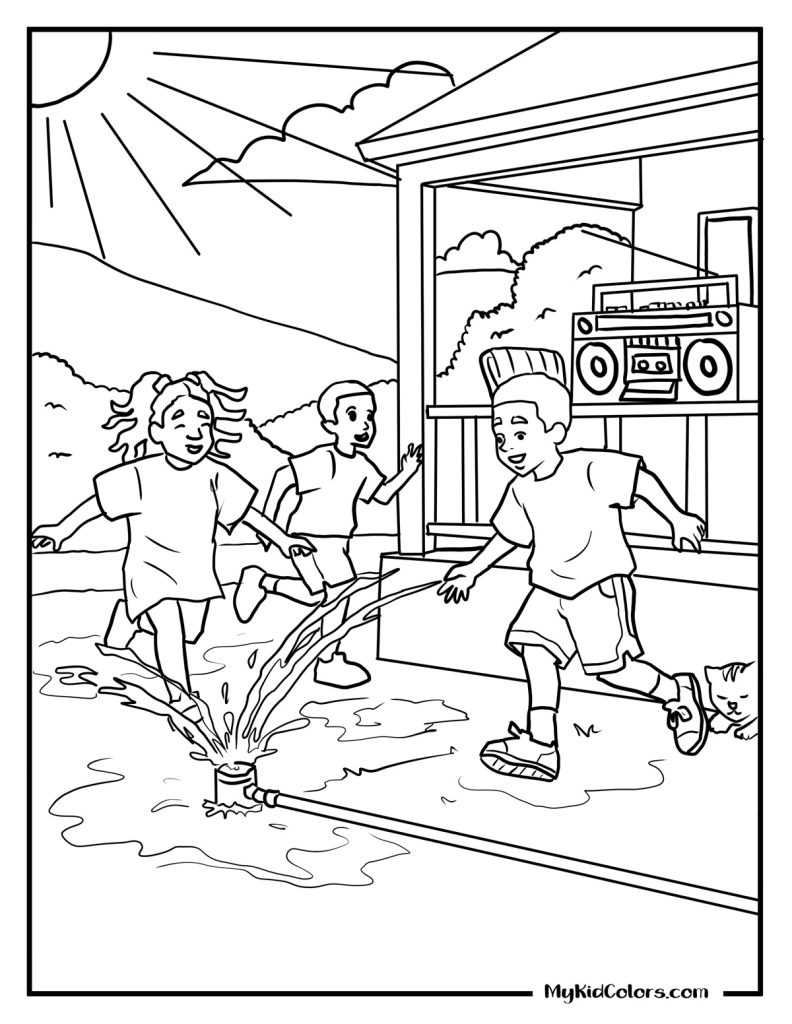 - Community Fun: A Solarpunk skate crew on the boardwalk (Page 7) and a 90s-style block party splash in the front yard sprinkler (Page 9)—highly engaging spring break coloring sheets.