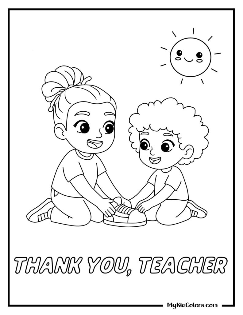 - Gentle Guidance: A smiling Black teacher with locs kneeling to help a child tie their shoe (Page 1)—perfect for preschool teacher appreciation coloring pages.