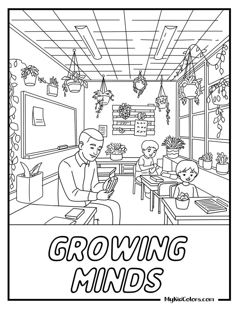 - School Counselor & Principal Gifts: Don’t forget the rest of the staff! Pages like “We Learn Together” (Page 7) or the “Growing Minds” solarpunk classroom (Page 10) work perfectly as principal appreciation coloring pages or gifts for the school counselor.