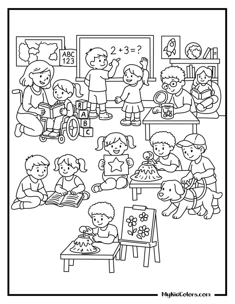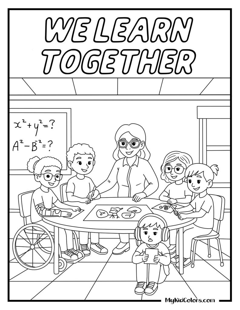 Perfect for elementary kids. These pages visualize teamwork, sensory needs, and affirming learning spaces.
