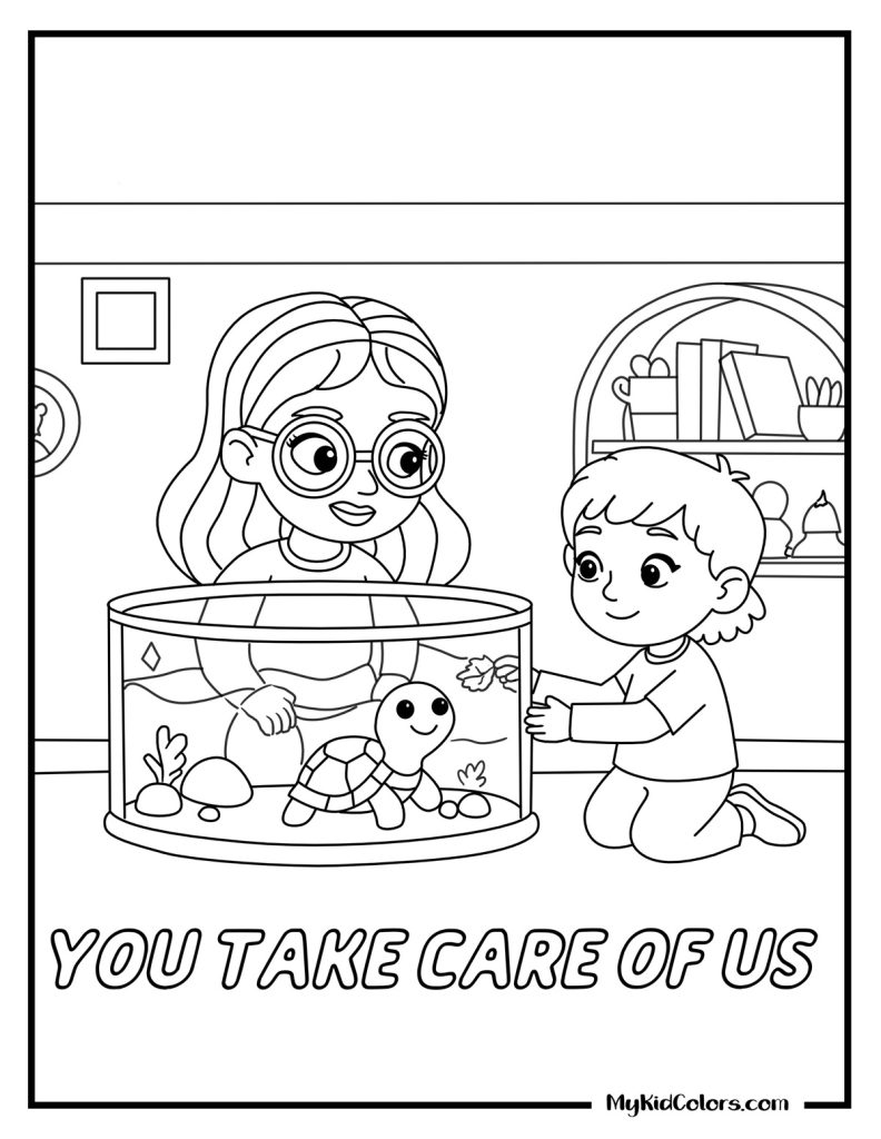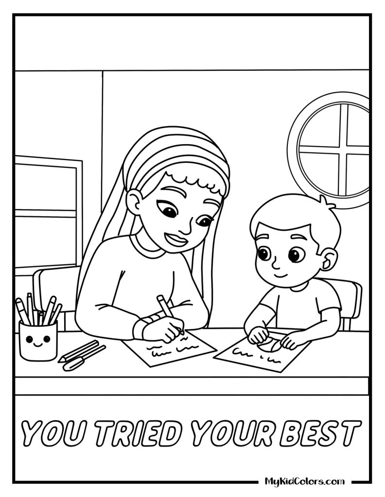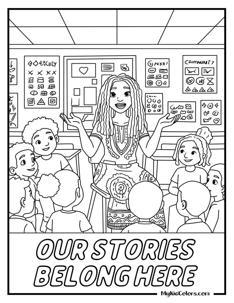 - Quiet Encouragement: Feeding the class pet turtle (Page 3) and a teacher in a headwrap writing an encouraging note on a student’s paper (Page 5). These are excellent teacher appreciation coloring sheets.