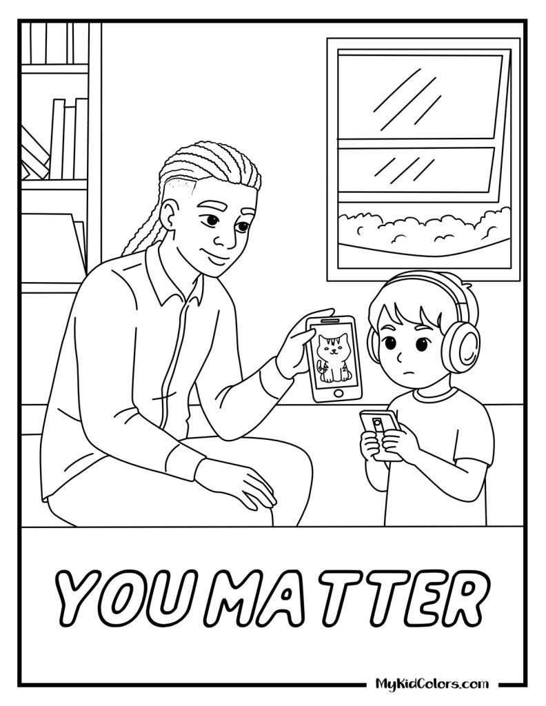 The Inclusive Family Coloring Collection includes 25 human-drawn illustrations centered on everyday moments — designed to make inclusion feel normal, joyful, and intentional.