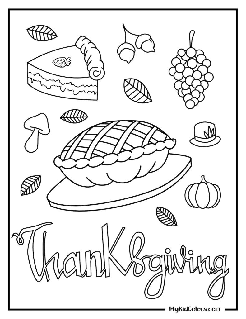 - Thanksgiving coloring pages with pumpkins, pies, and fall leaves.