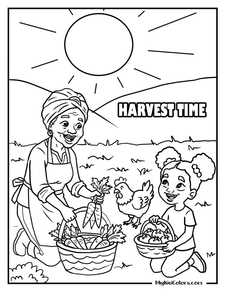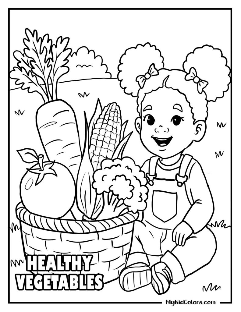 - Page 1: A cheerful set of carrot, broccoli, tomato, and corn with a Black toddler beside a basket, designed with bold outlines to serve as an easy and engaging first vegetable coloring sheet for beginners.
