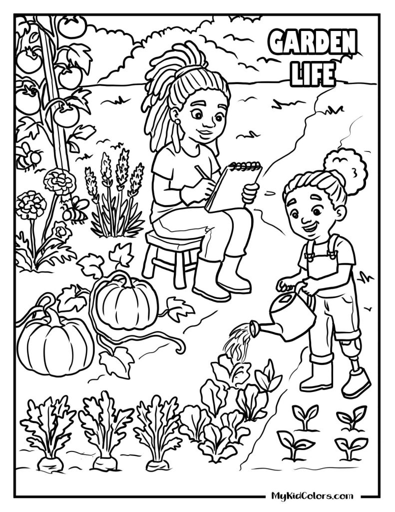 - Page 11: A richly detailed garden ecosystem filled with plants, insects, and activity encourages observation, making it perfect for lessons using vegetables outline images and discovery-based learning.