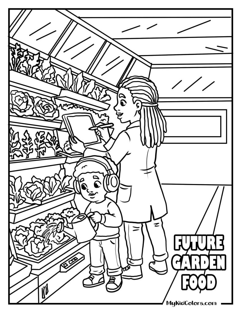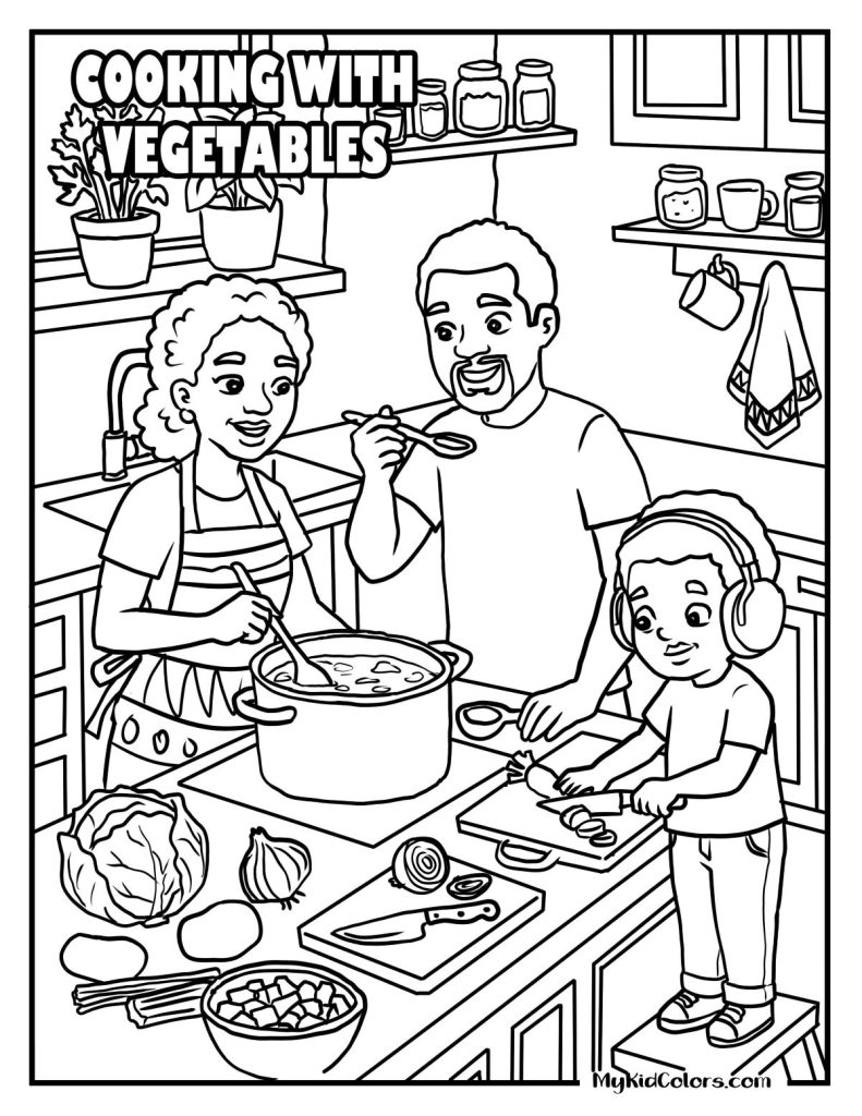 - Pages 7 & 8: Cooking at home and exploring an urban garden connect vegetables to real meals and environments, making these pages ideal as food coloring pages and interactive vegetable coloring worksheets.