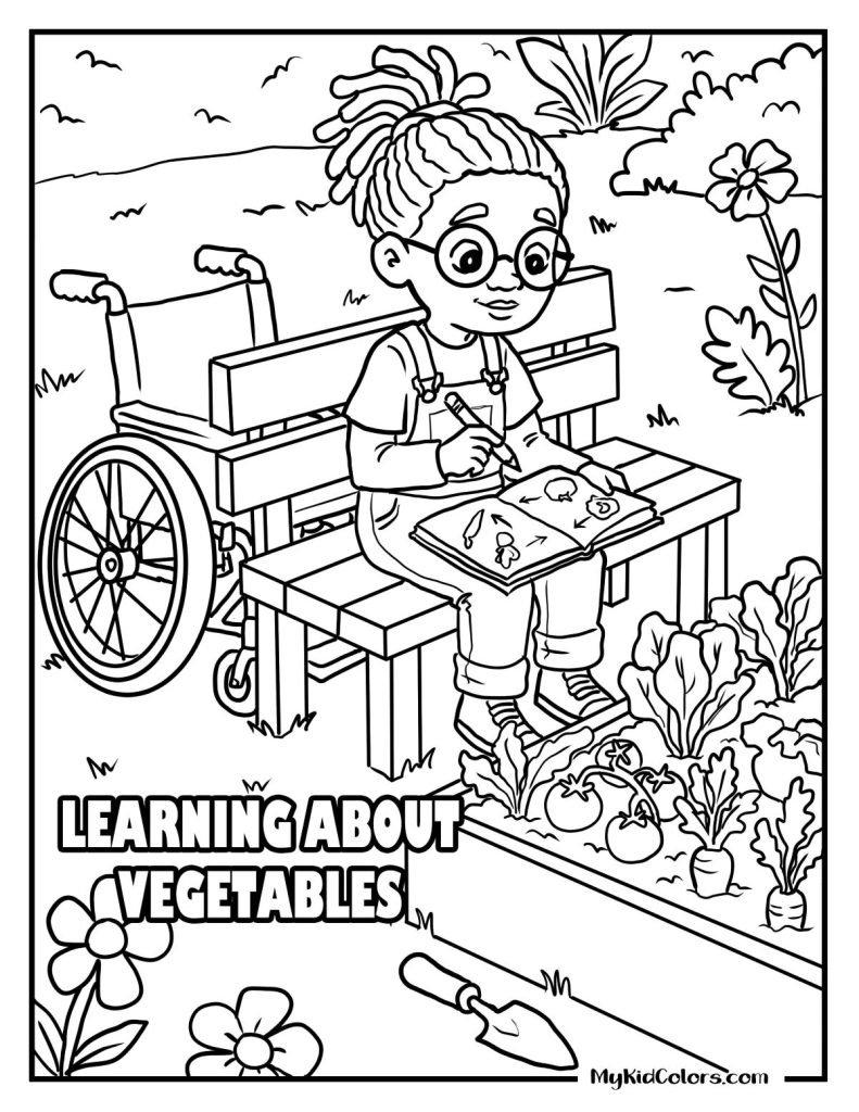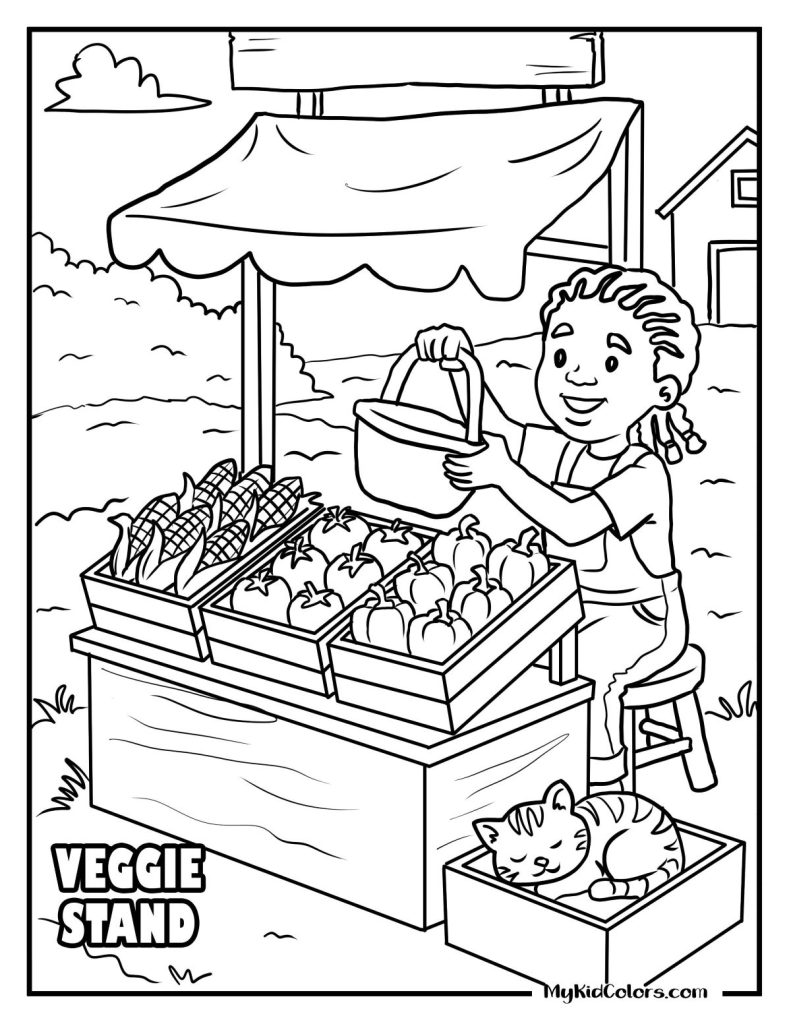 - Pages 4 & 5: Backyard gardening and a veggie stand scene introduce everyday family life and simple routines, making them perfect vegetable coloring pages for preschoolers learning through familiar environments.