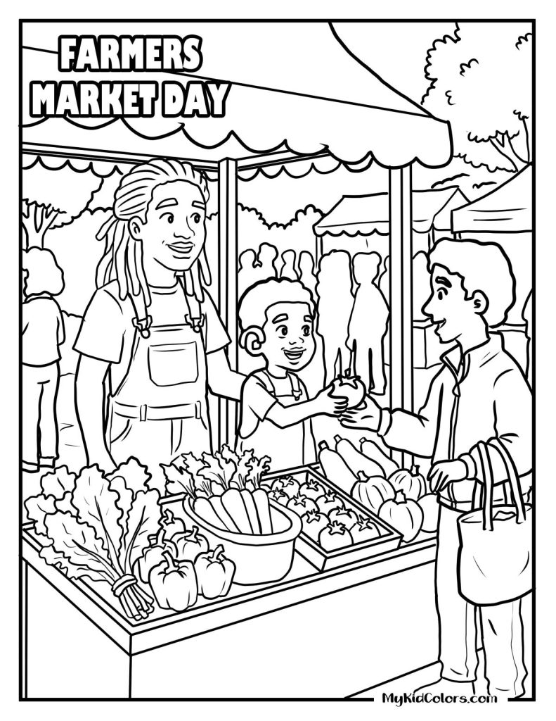 - Page 6: A lively farmers market scene filled with fresh produce and interaction helps children understand community exchange while engaging with detailed produce coloring pages.
