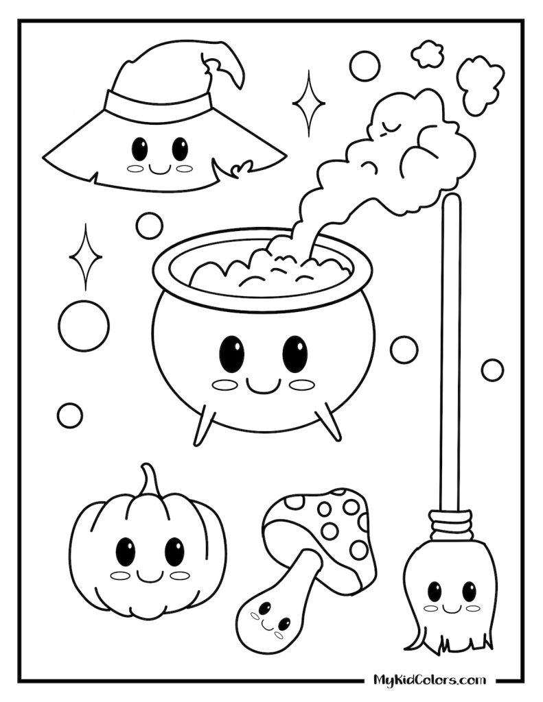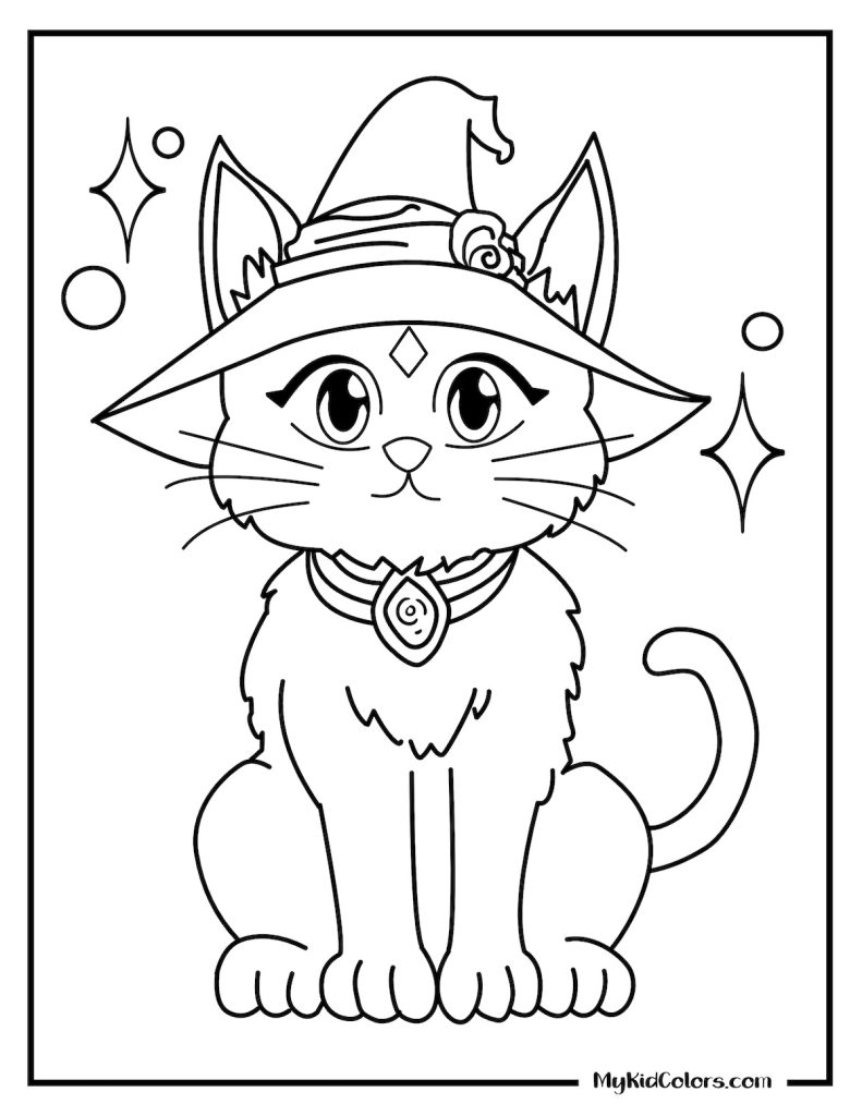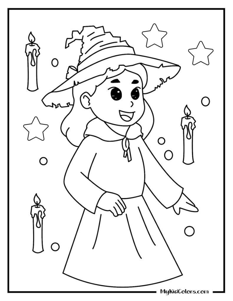• Creative Play: Kids can bring characters to life, from a cat with witch hat coloring page to cute witchy colouring pages.